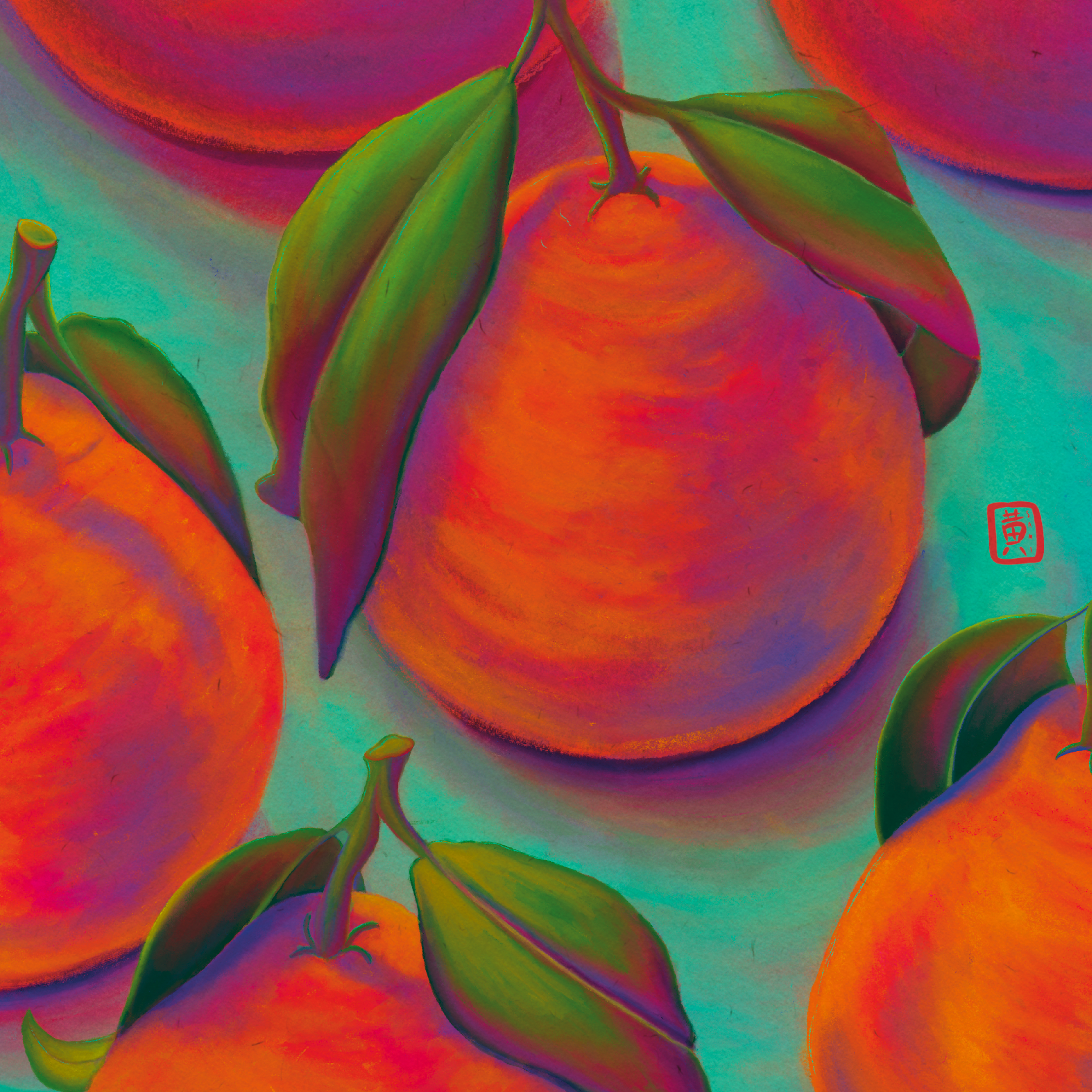 An illustration from 2025 using Procreate. This drawing uses color to depict vibrant mandarins in a still state.